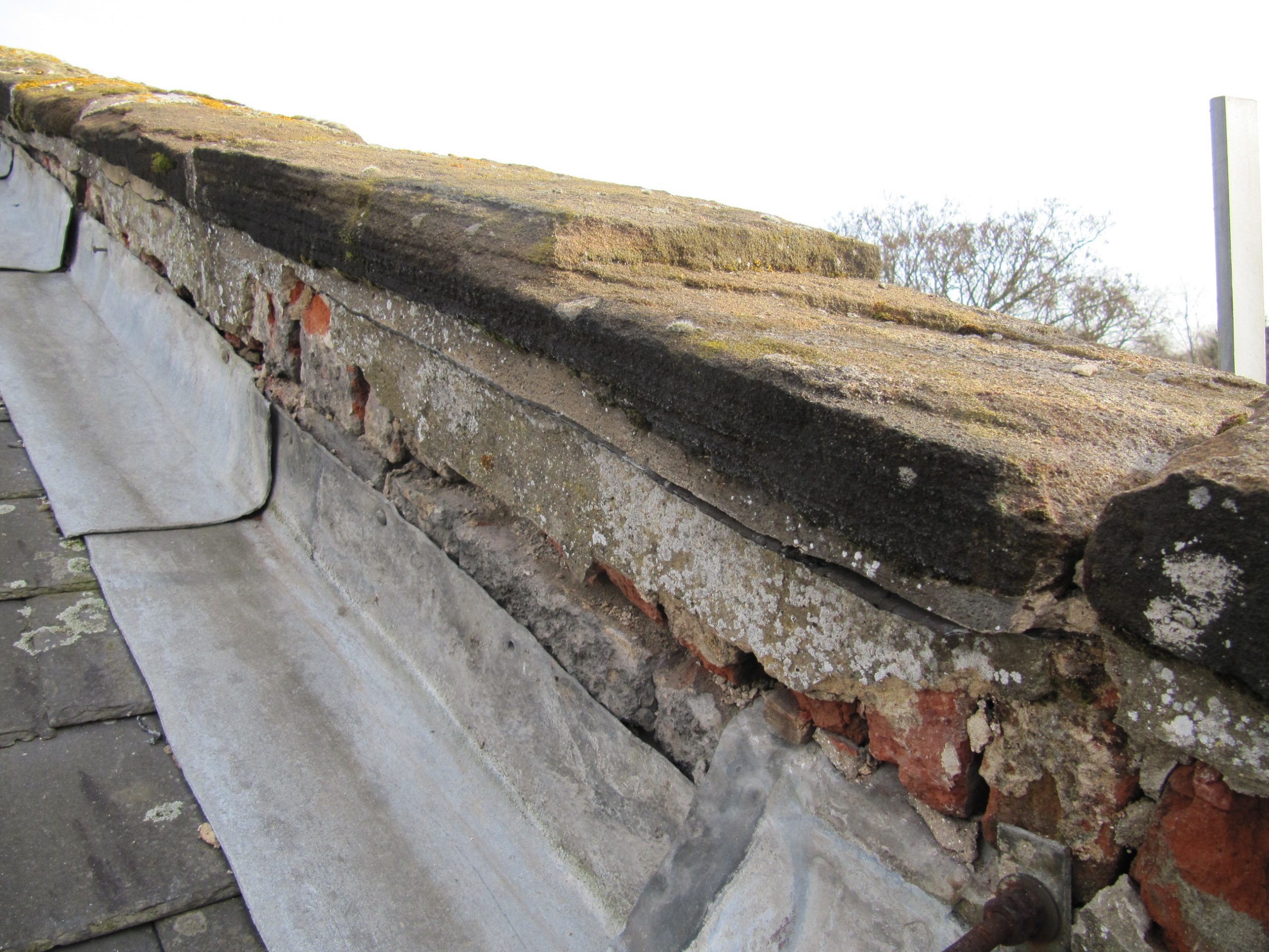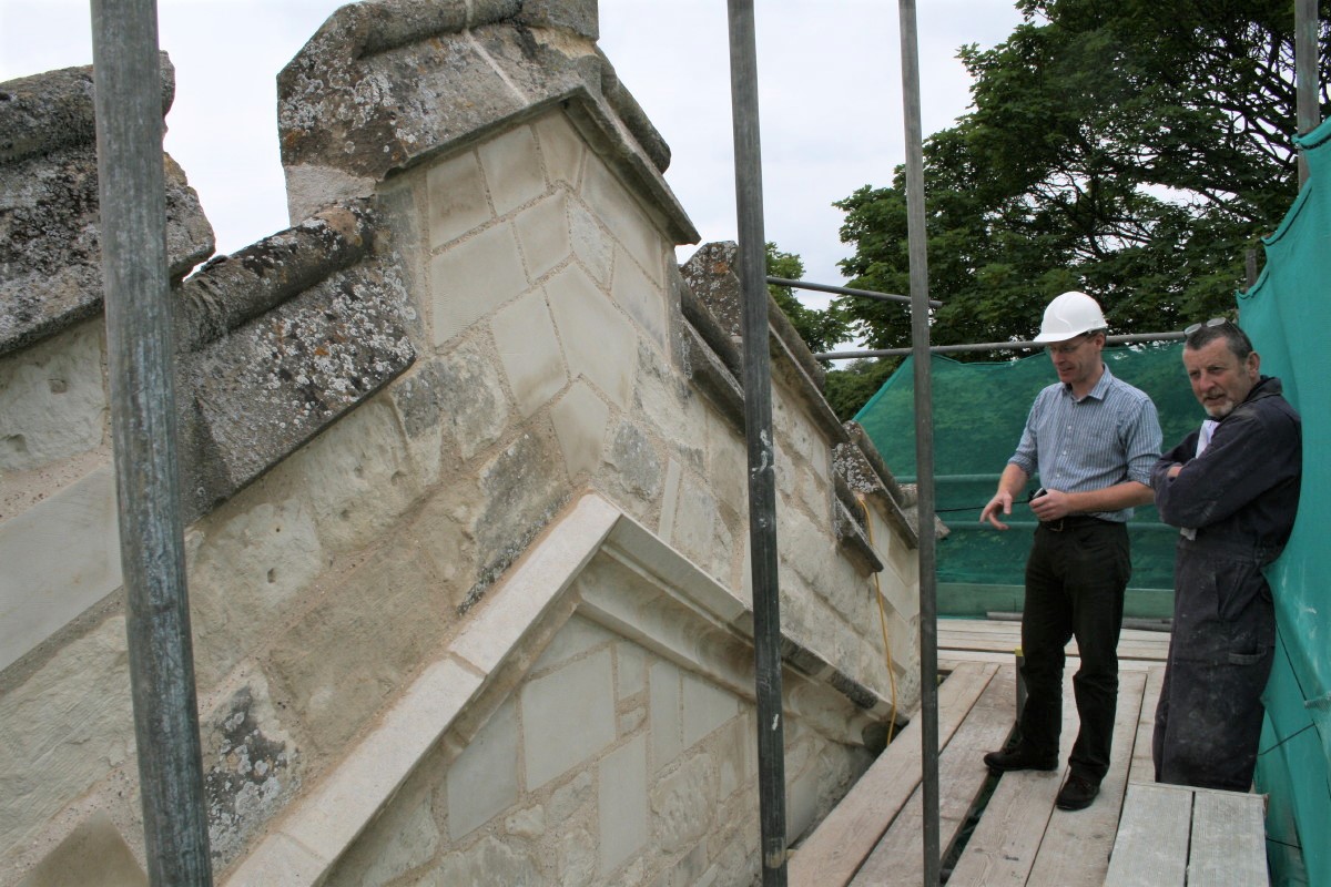 Stonework repairs included replacing all the coping stones on the parapets (above) and most of the high-level string course, removal of cement render, brushing down and repointing of stonework of all five bays in the south elevation and the single bay in the east elevation together with all five buttresses. Considerable amounts of stone were replaced including hood moulds and mullions, but salvaged stones were relocated where possible.