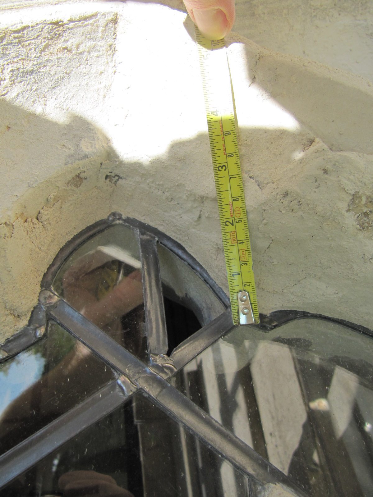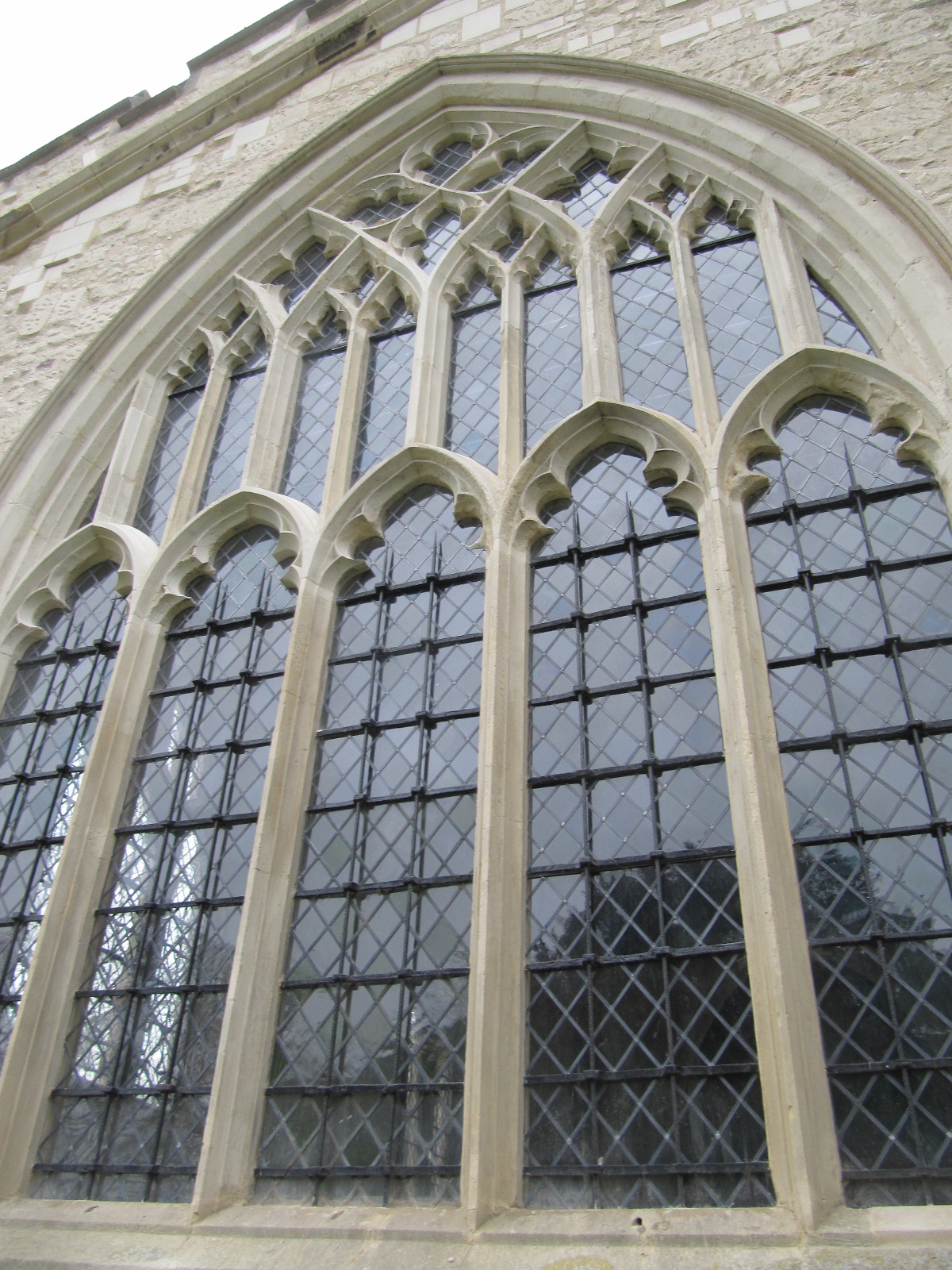 A full scaffolding was erected across the east elevation and buttresses and the north-east “trial bay”. All the cement render was removed from the parapet, stringcourse and east wall together with the four buttresses. Any decayed or fractured stone was removed to a depth of 100mm. Much of the interior of the buttresses was found to be in very poor condition, requiring new stone to be inserted to greater depths. The wall above the window was very extensively restored including the parapet (above). Beneath the window almost all the stone was also replaced. Large amounts of the window tracery were also repaired. A fine colour matched lime-based masonry was applied to all masonry. Conservation was under the supervision of Matthew Beesley of Gem Conservation. Much of the glazing was bowed out of position with lead tags detached from the ferramenta, which were coming away from the stone jambs. The window was virtually rebuilt (below).