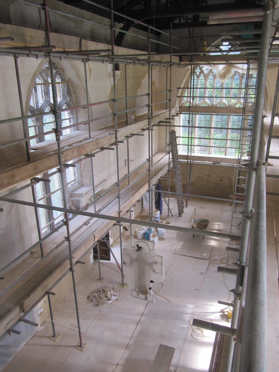 A full internal scaffold was erected, with a screen separating the chancel from the nave to allow services to continue during the works (above). The works included removal of loose/damaged plaster at high level which had been damaged by ingress of water. Failings in the roof drainage of both the north and south sides of the chancel roof were addressed separately around this time. At low level hard cementitious plaster was removed and all was replaced with lime-based plaster. Hard cementitious pointing in the chancel floor was removed and replaced with lime-based mortar. Unusually, a large section of the chancel floor is of “clunch” construction, inset into the surrounding York stone. Approximately 15% of the slabs were cracked and replaced. Some stone repairs were also required to the window-sills and tracery of the north and south windows, the blocked doorway in the north wall and the piscina and sedilia in the south wall. Glazing repairs included some re-leading of the existing glass and re-tipping of the ferramenta in phosphor bronze. All the glass was subject to a conservation clean. Three coats of limewash were applied to all the interior plaster. A watch was kept for any archaeology but virtually nothing was found apart from a small section of frieze in the north wall which was recorded. Externally the French drain below the north elevation of the chancel was removed and the ground was re-instated.