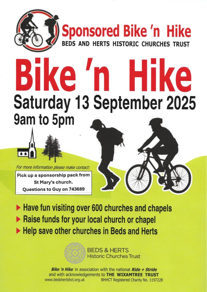 Enjoy walking or cycling around our beautiful local churches and countryside, and while you are doing it, raise sponsorship money for the Beds & Herts Historic Churches Trust. They foster interest in church buildings and provide grants to restore their fabric.
